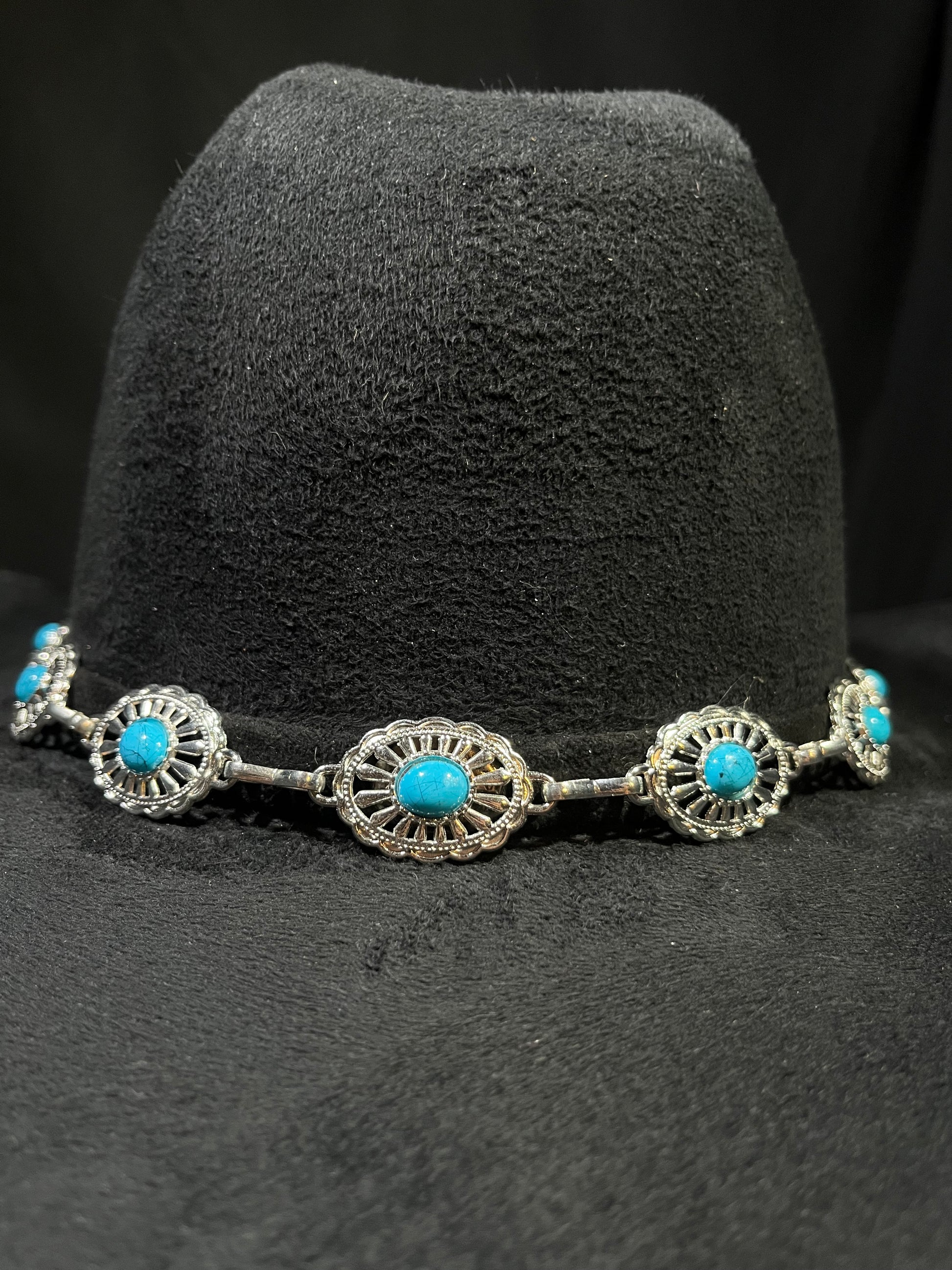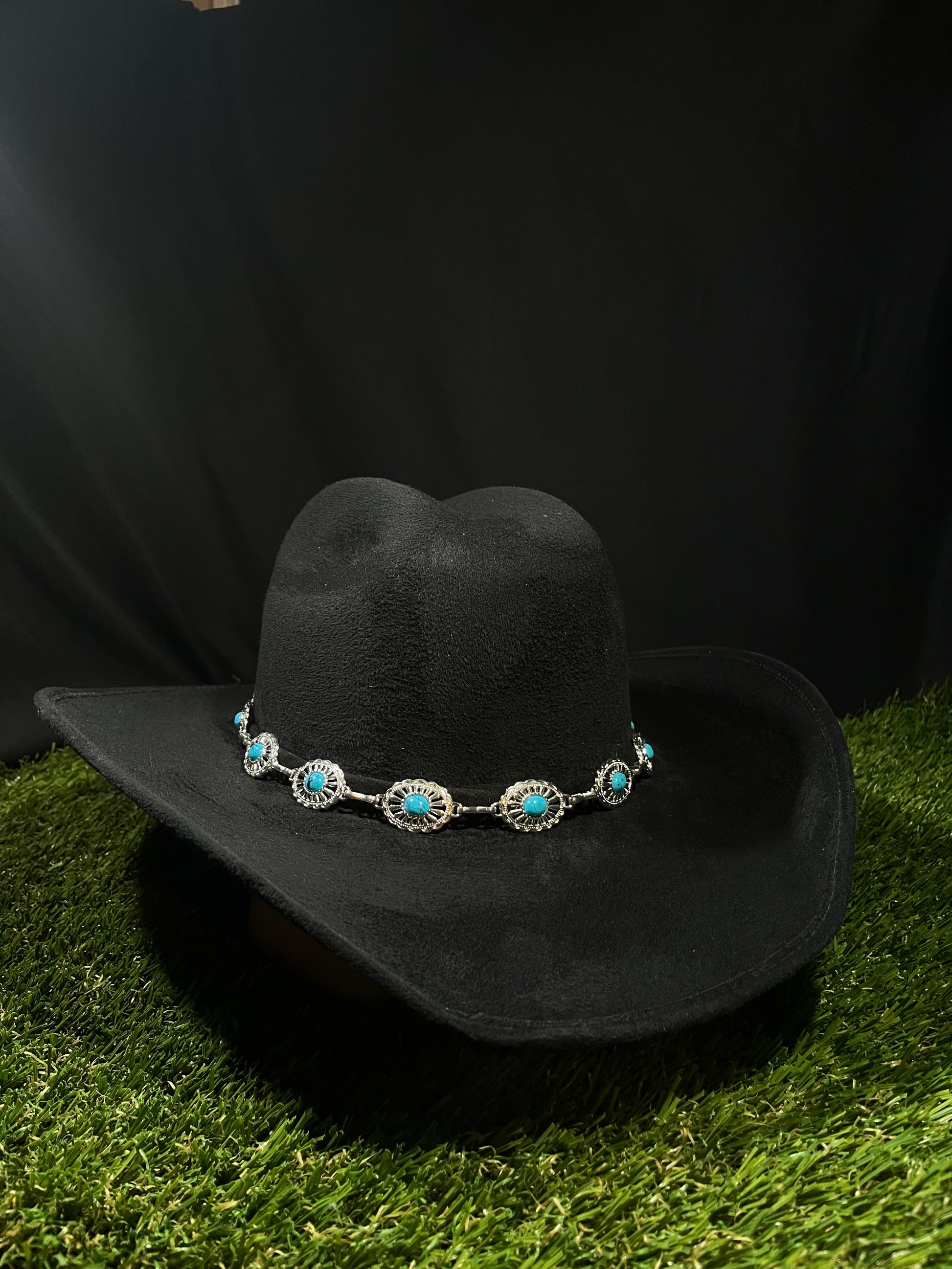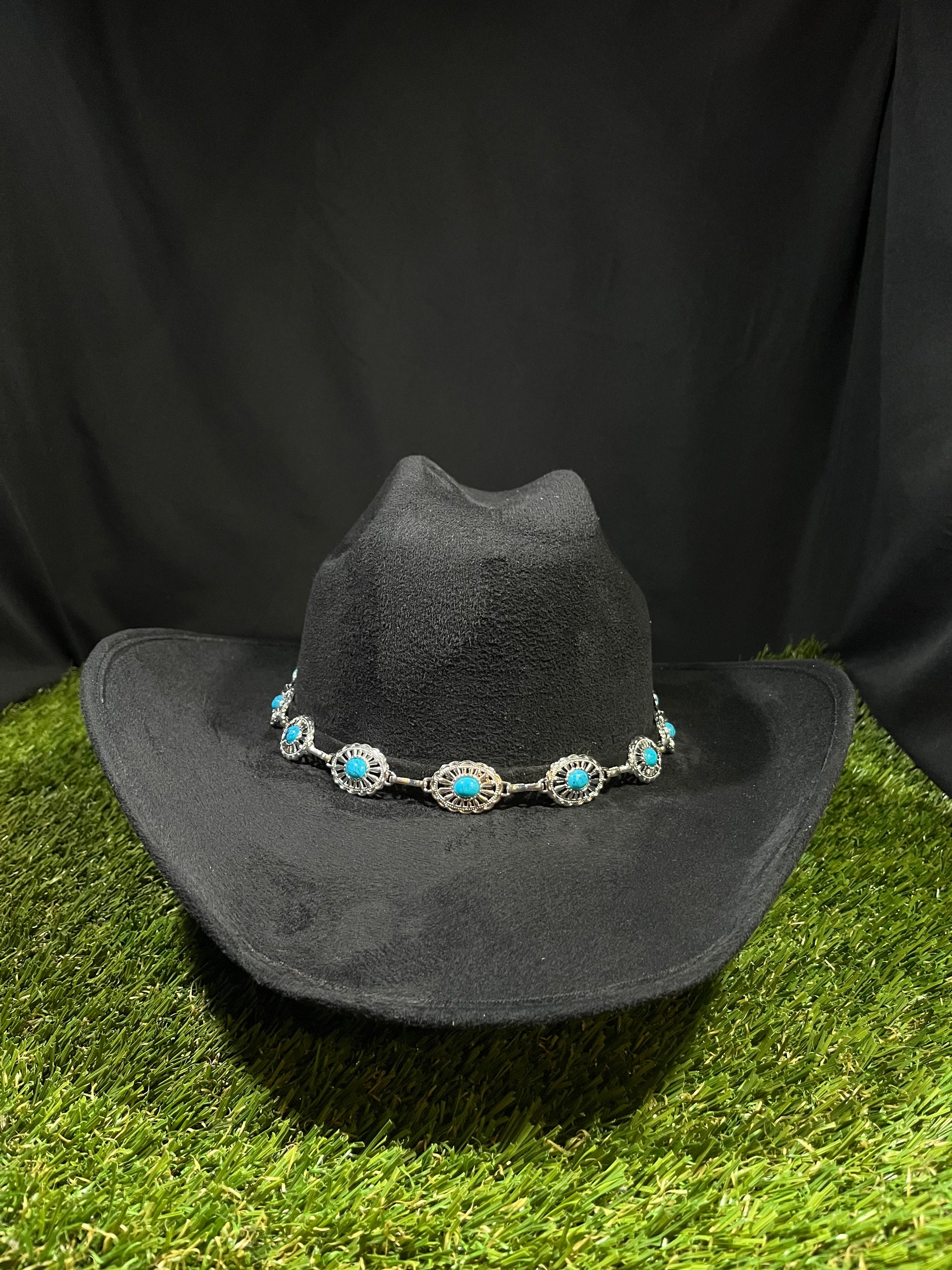 A timeless and on trend cowboy hat that’s crafted in a brown faux suede with a coordinating band wrapped around. Black Suede with turquoise blue rhinestones Hat. The crown is stiffened and shaped into a clean and ridged design.