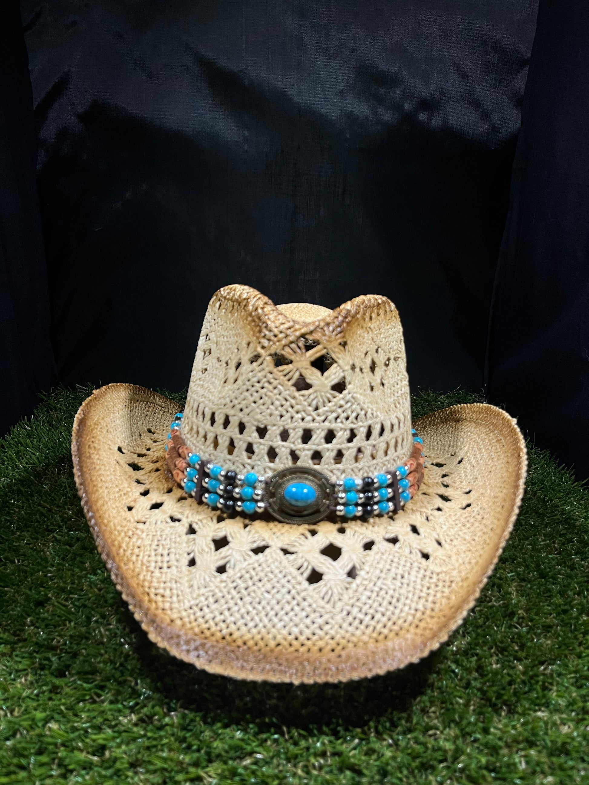 Light Brown Straw Cowboy Cowgirl Hat - Breathable Design with Turquoise Buckle and Beaded Band