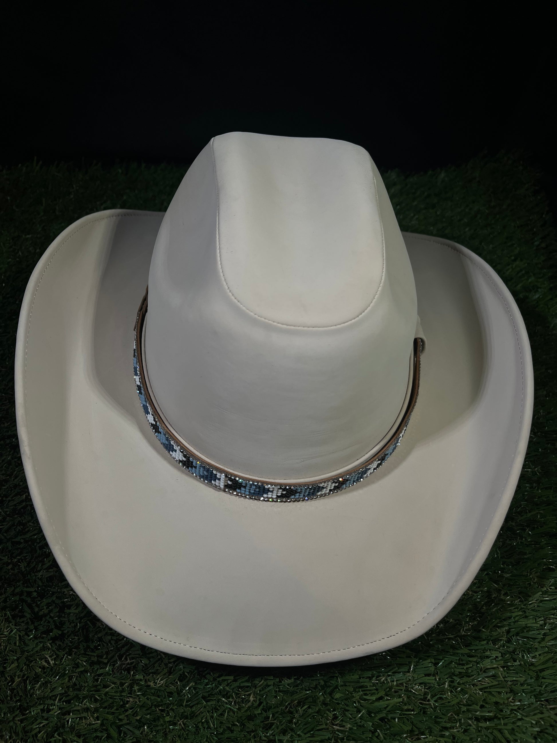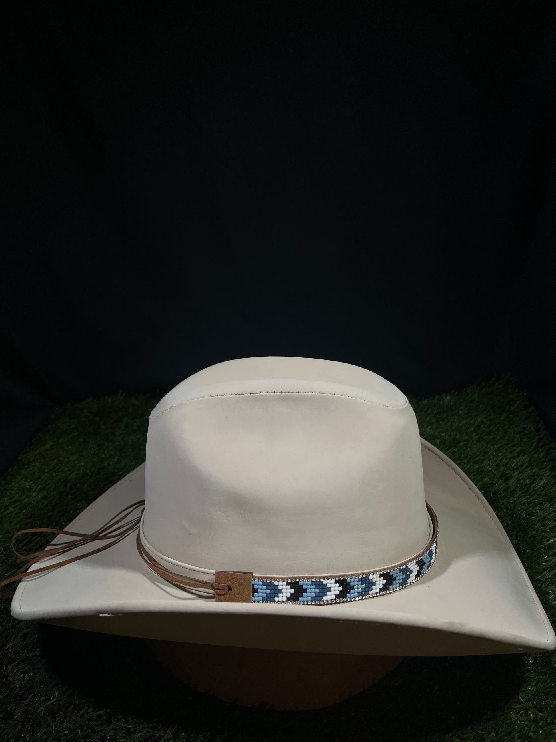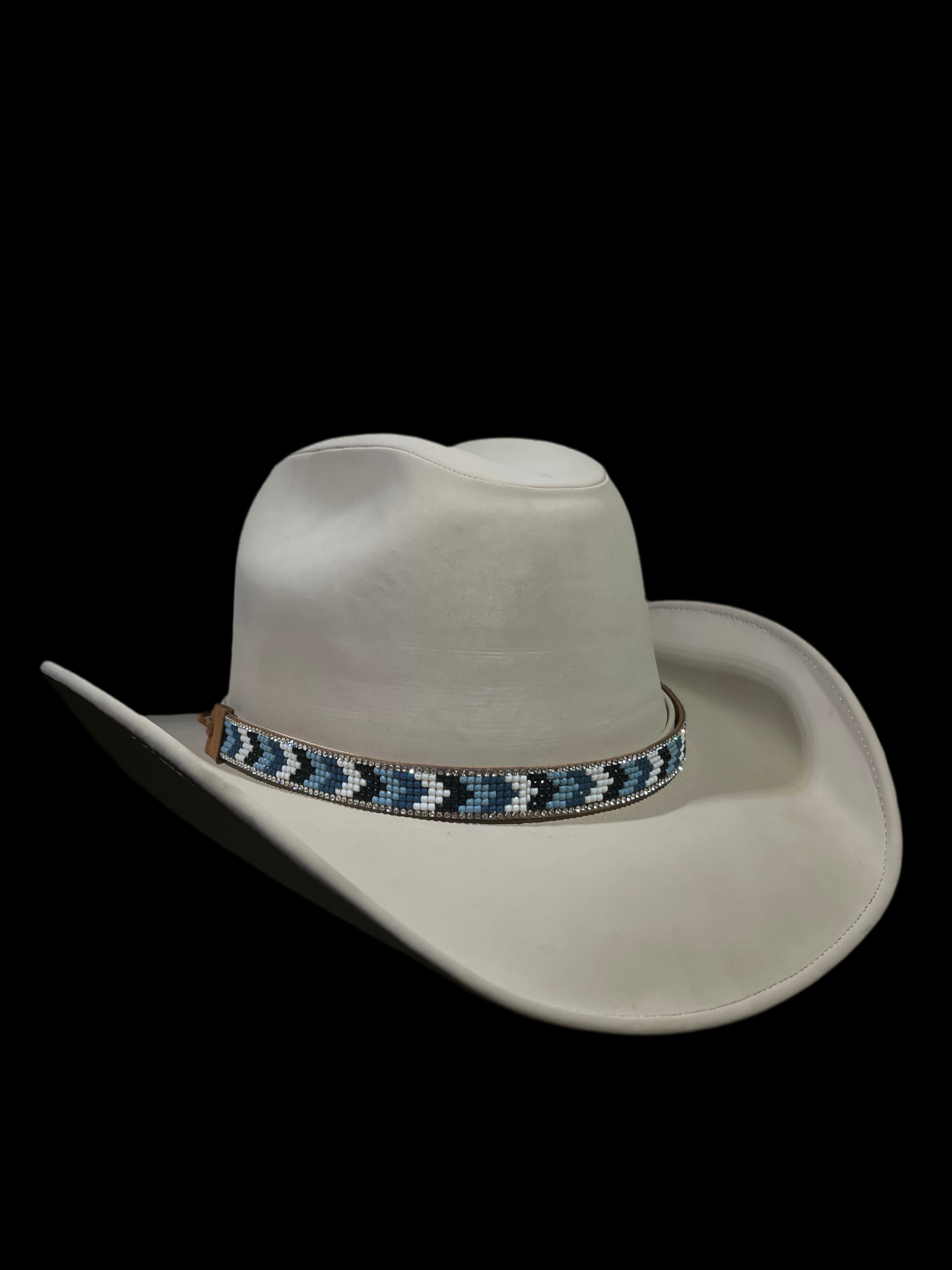 Bold style meets Western heritage. This classic ivory hat features a light brown band with blue, black, and white patterned accents inspired by Native artistry, finished with a subtle shine that catches the light beautifully. Perfect for rodeos, festivals, or making a statement with timeless flair. Crafted with high-quality felt for durability and lasting style.