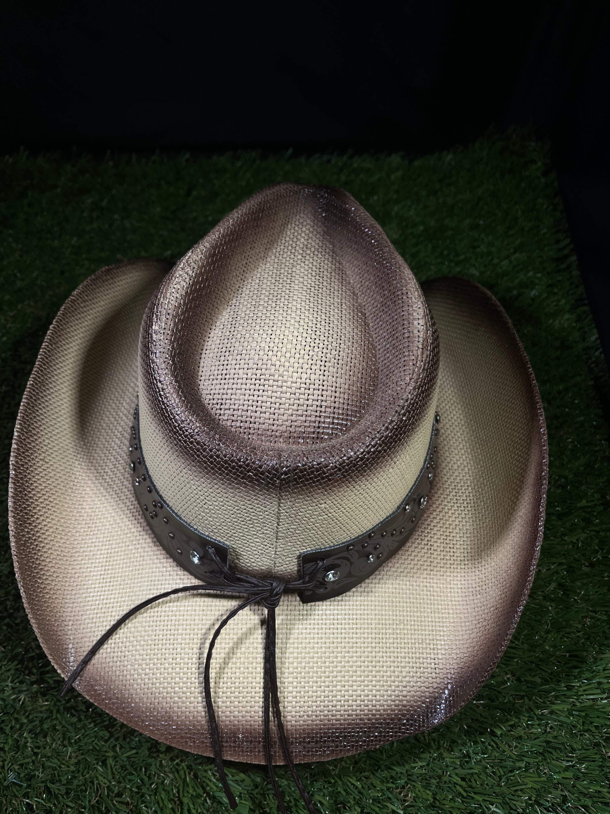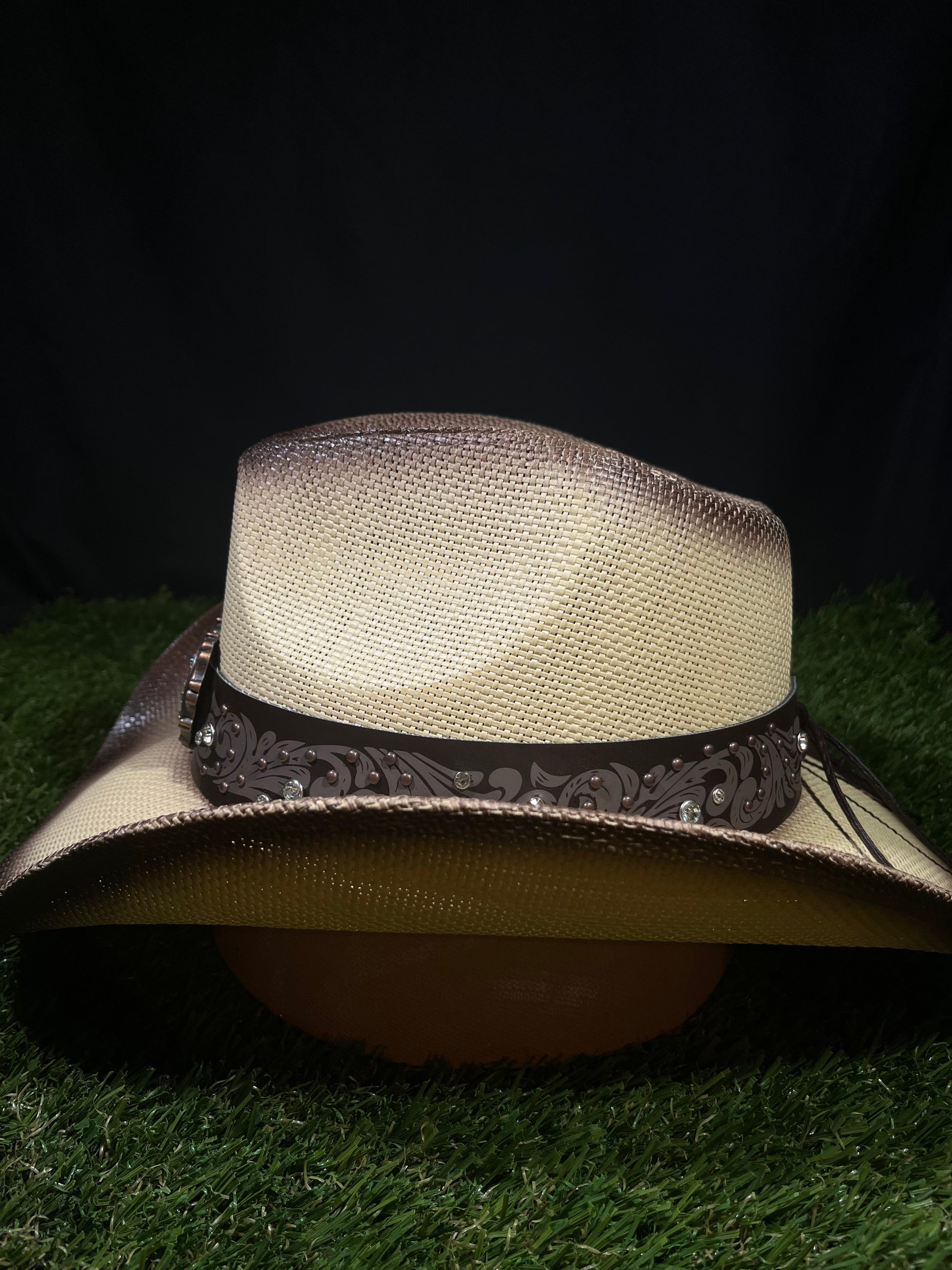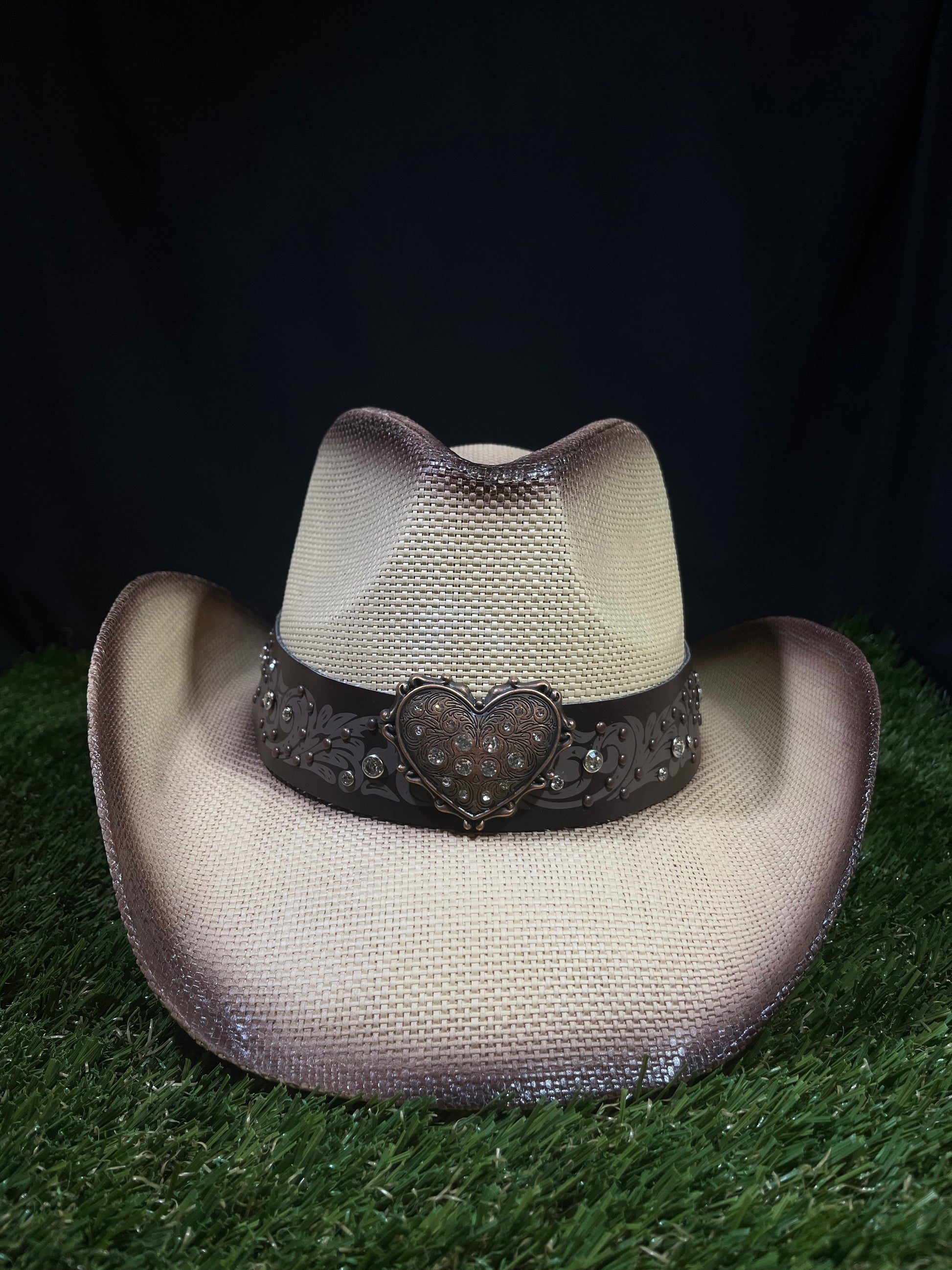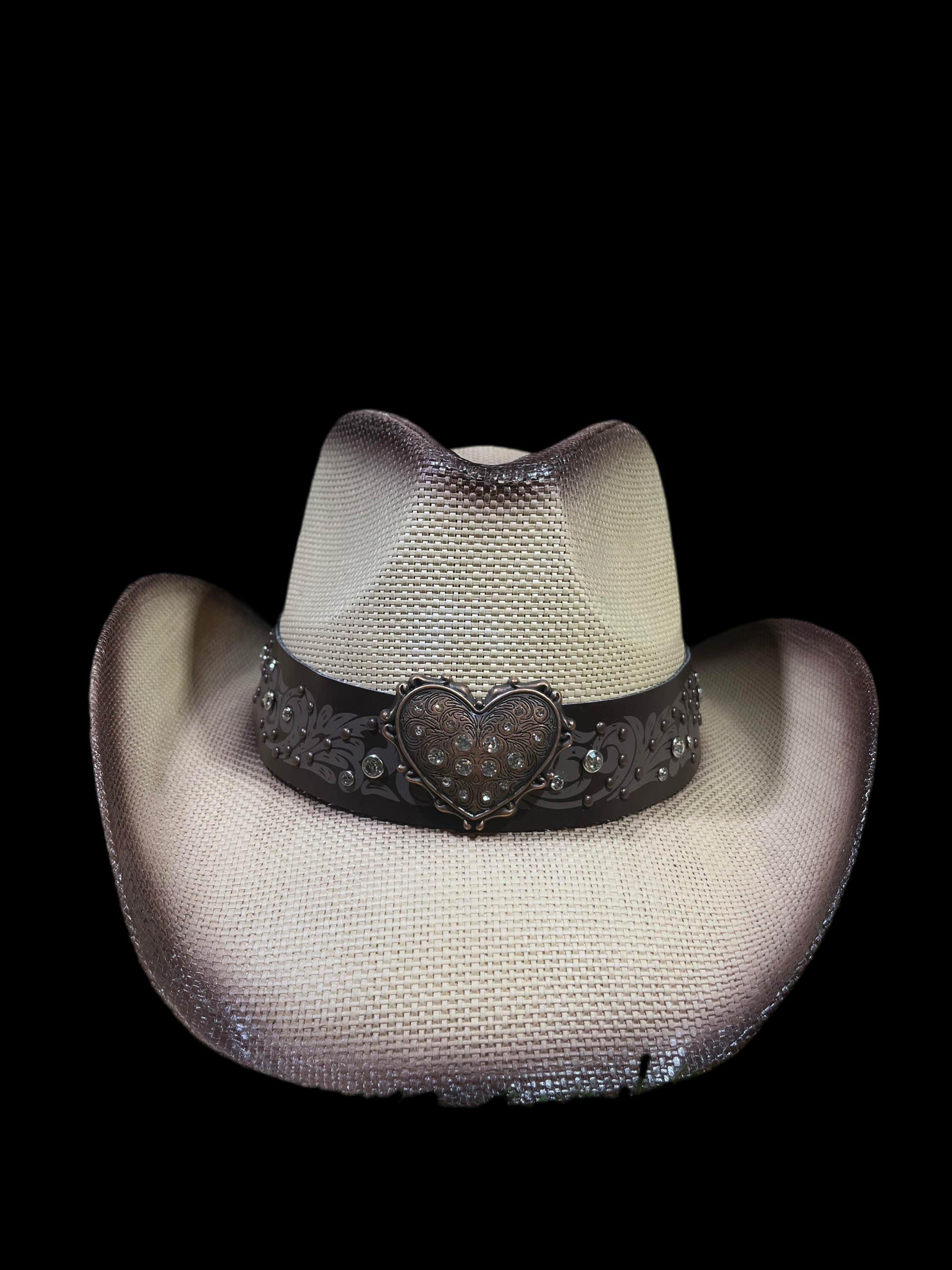 Straw Western Cowboy Hat With Brown Heart Band- Light Brown