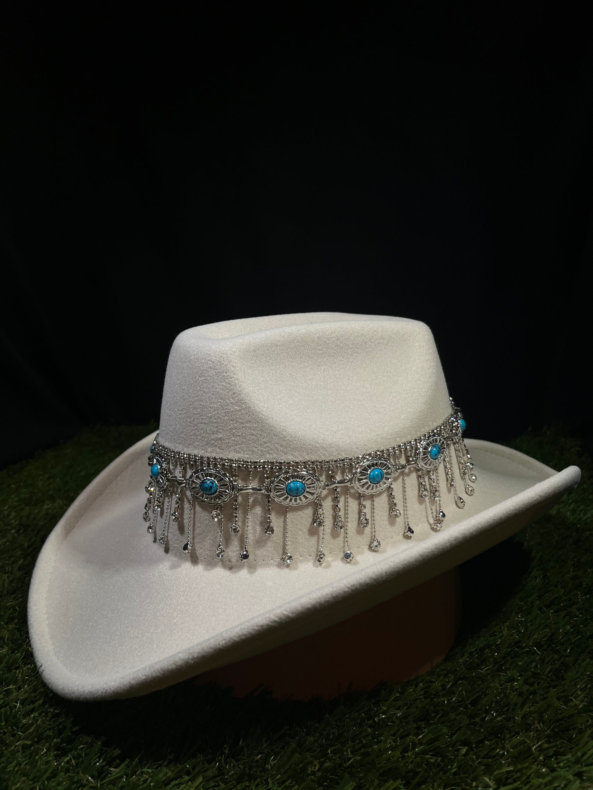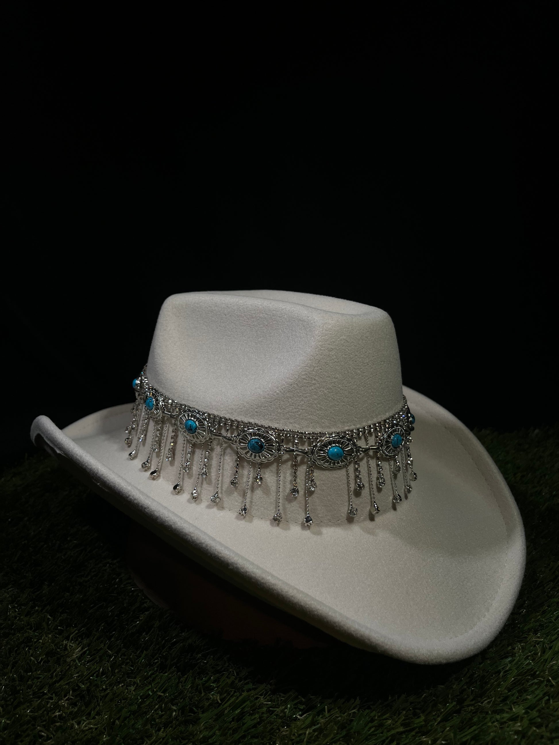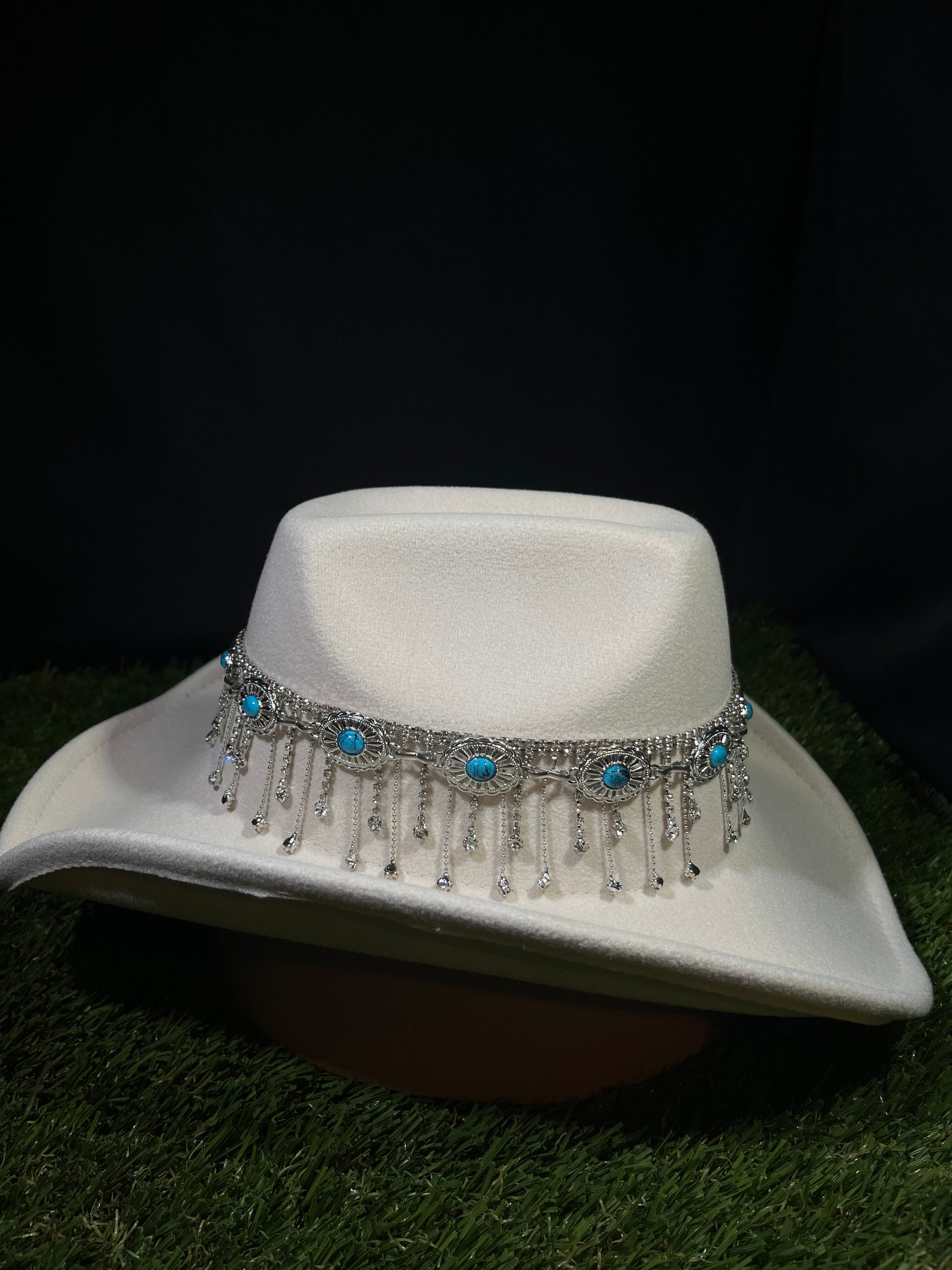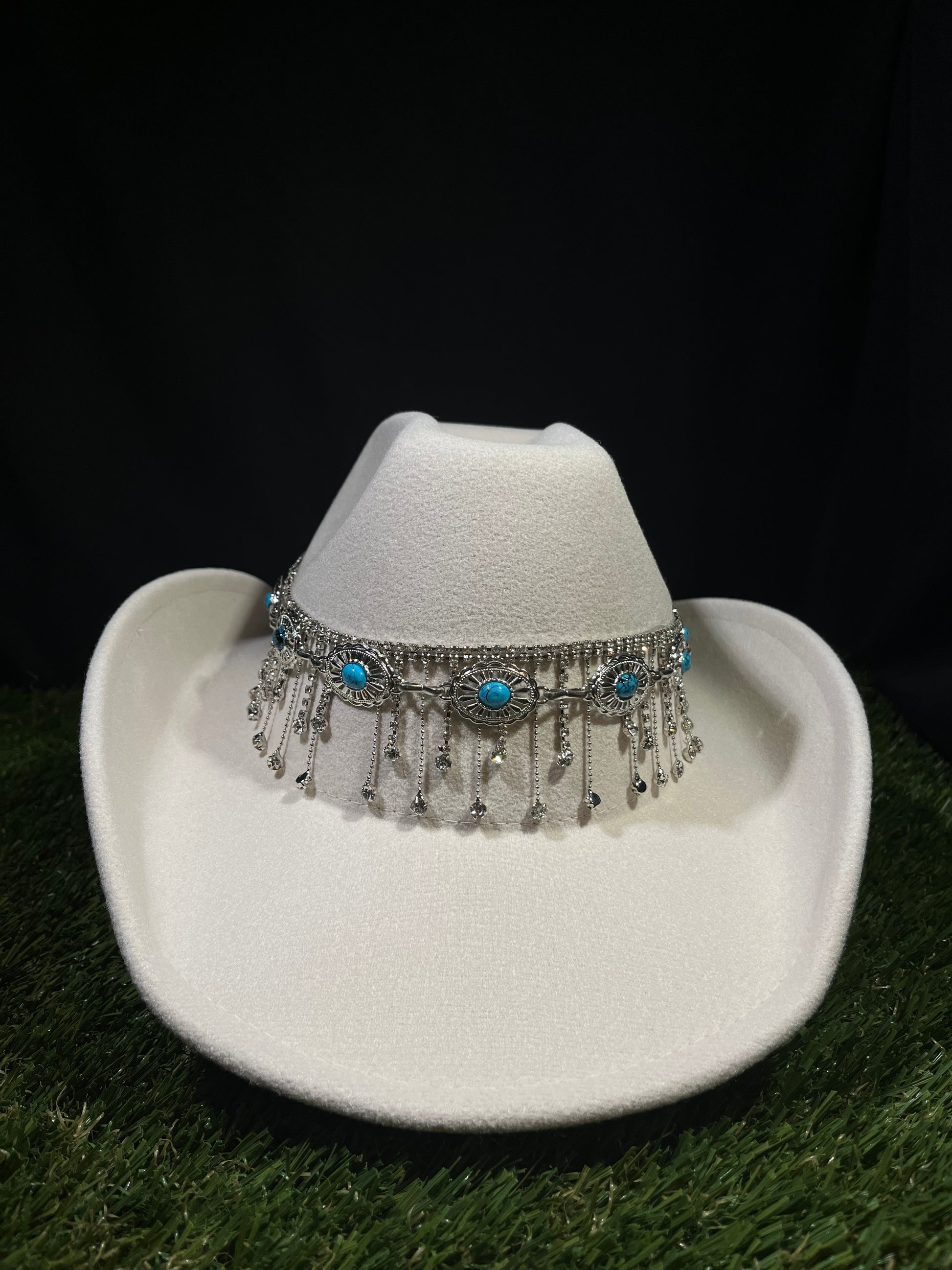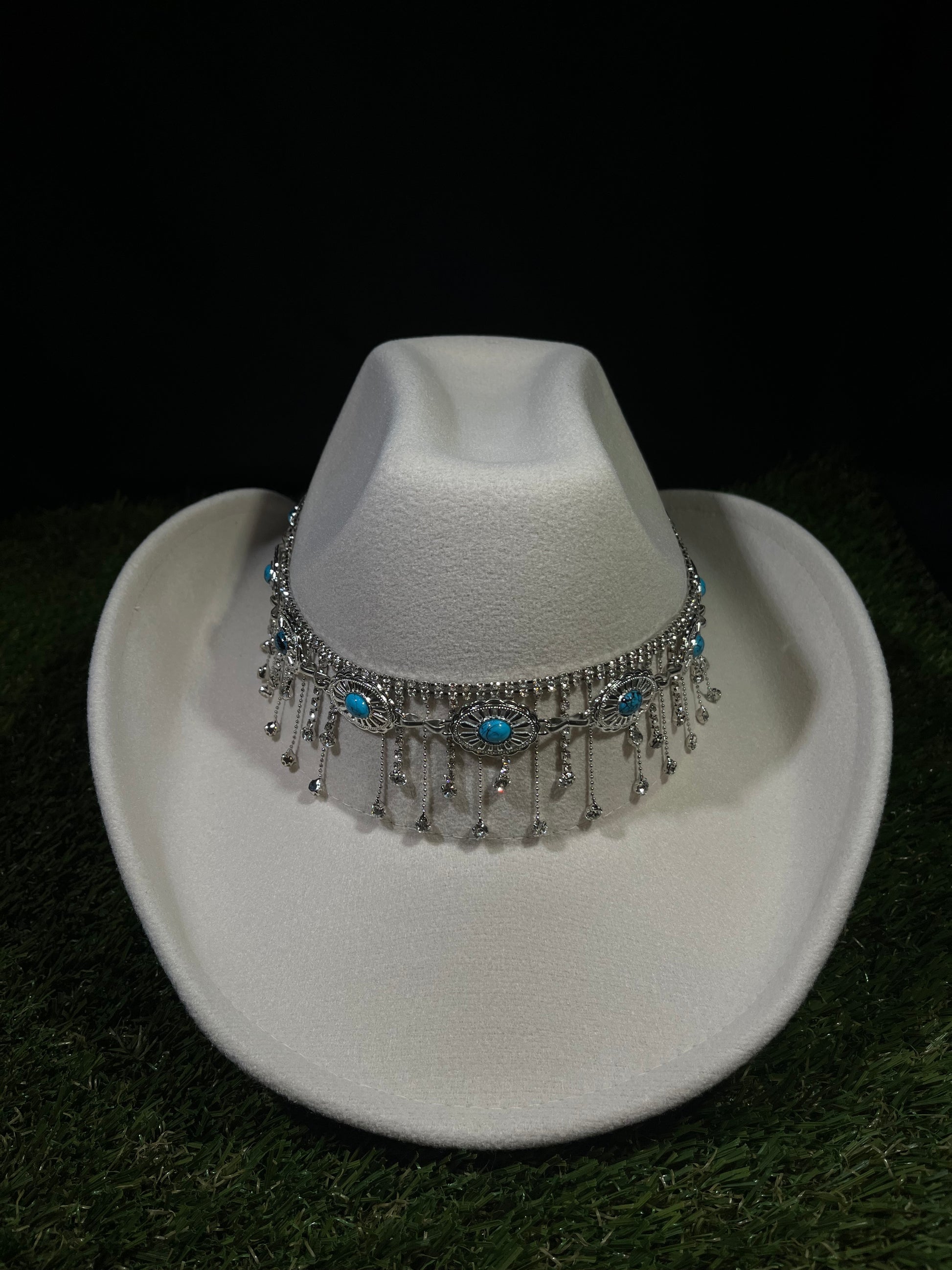 Capture the spirit of the West with a modern twist. This statement hat features a striking white and ivory base, accented with soft blue tones and a sparkling silver dreamcatcher-inspired rhinestone band. Perfect for standing out on the trail, at the rodeo, or anywhere you want to turn heads. Crafted with quality materials for a look that lasts and a style that’s unforgettable.